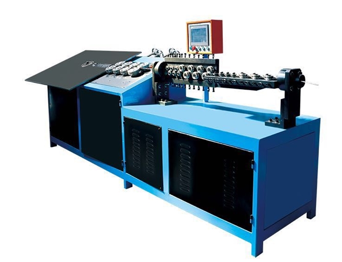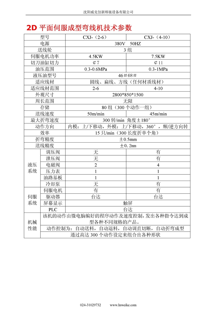 2D平面伺服弯线机: 本设备设计理念:以机器代替人工,无需调直材料,无需开模即可生产。您需要弯什么形状,只要它是在一个平面上,我们的机器都可以满足您的需求。 适用于铁线、钢线、不锈钢线及有色金属线材(圆、方、扁线),打(弯制)方、圆、六角、椭圆用不规则形状和各种平面扣类,各式挂钩等。 2D平面伺服成型弯线机机器原理 1、伺服成型弯线机设备选用细分驱动器控制高精度步进电机送线,机械传动选用精密齿轮连接,永远保持不变的送线精度和送线速度; 2、剪切油缸液压站配备强制风冷散热器,加倍延长液压系统元件的使用寿命; 3、控制系统采用PLC与文本显示器连接,既方便操作,又保证了控制系统的稳定性,而且设计有生产数量预置功能控制整机运行。由精密步进电机驱动送线轮转动,用PLC与文本显示器代替步进电机控制器,可以根据需要任意修改步进电机缓升缓降曲线与步进电机最高转速,杜绝了机械传动的冲击,绝对保证了实际传送铁线长度与理论计算长度一致; 4、伺服成型弯线机在设计预算时,已经把每MM长度分为10段脉冲,进一步确保了长度精度的设置;可调液压油缸剪切,可以保证圆圈切口的整齐性,剪切时间和退刀时间均可以在文本显示器上直接修改; 5、伺服成型弯线机设计有手动慢速送料、慢速退料功能,操作简便、减少材料损耗。